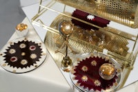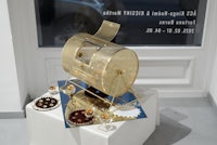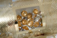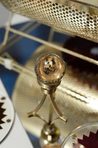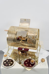 Laser-cut mirror plexi, dried flowers, herbs, metal lottery cylinder,