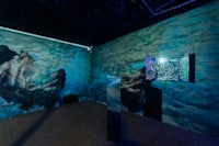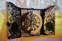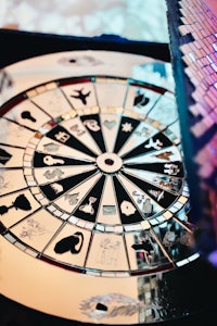 The transformation of the dartboard embodies the behavioral pat- tern of Hera, the Greek goddess. A vulnerable female figure is projected onto the wall, with a mirror covered dartboard in front of it, representing jealousy and the feeling of abandonment. The game objects draw attention to the method inherent in the figure of Hera, whether it be purposefully, focused, calculated actions to achieve something or someone. The negative aspect of this can manifest when we blame others for our own grievances, problems, or traumas and hurt them, or when we direct our envy towards them, projecting our bitterness. The dart game symbolically transforms into the furious and jealous Hera, who strategically acts in pursuit of her desires, even projecting jealousy onto her own female gender. On the surface of the dartboard, schematic illustrations of fundamental desires emerge, drawing from contemporary and universal systems of symbols.