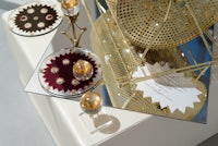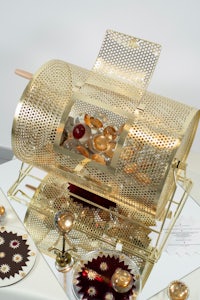 Laser-cut mirror plexi, dried flowers, herbs, metal lottery cylinder,